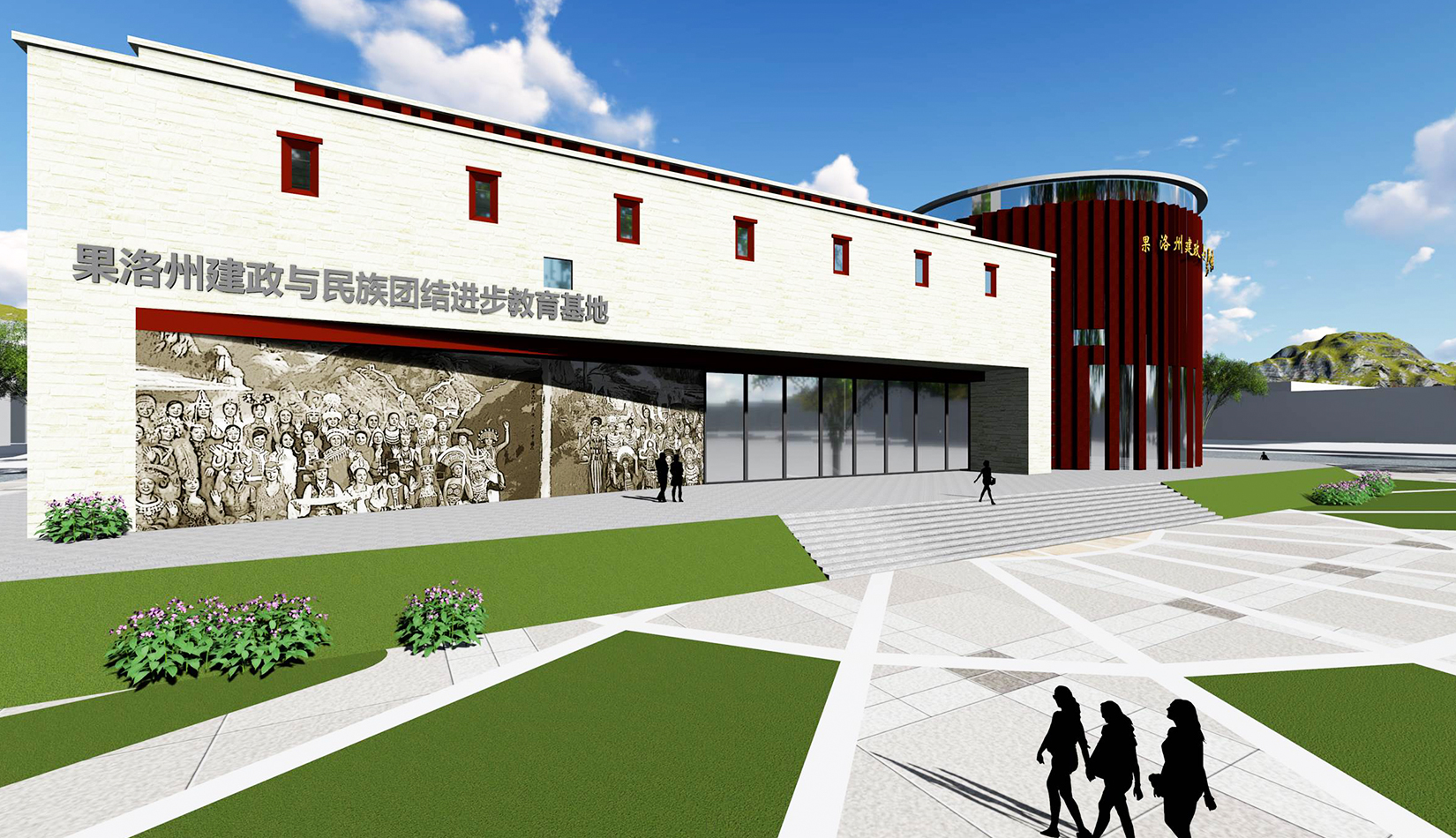 設計造型整體為中心聚攏的形態(tài),圓形體塊是建筑的核心,象征著黨的領導,各分支體塊象征著分布在果洛的各個民族,體現(xiàn)出各民族團結一心,同心向黨,在黨的領導下團結一致、共同奮斗;另一方面,圓形體塊與各分支體塊的簇擁關系也象征著各民族緊密團結,永不分離。