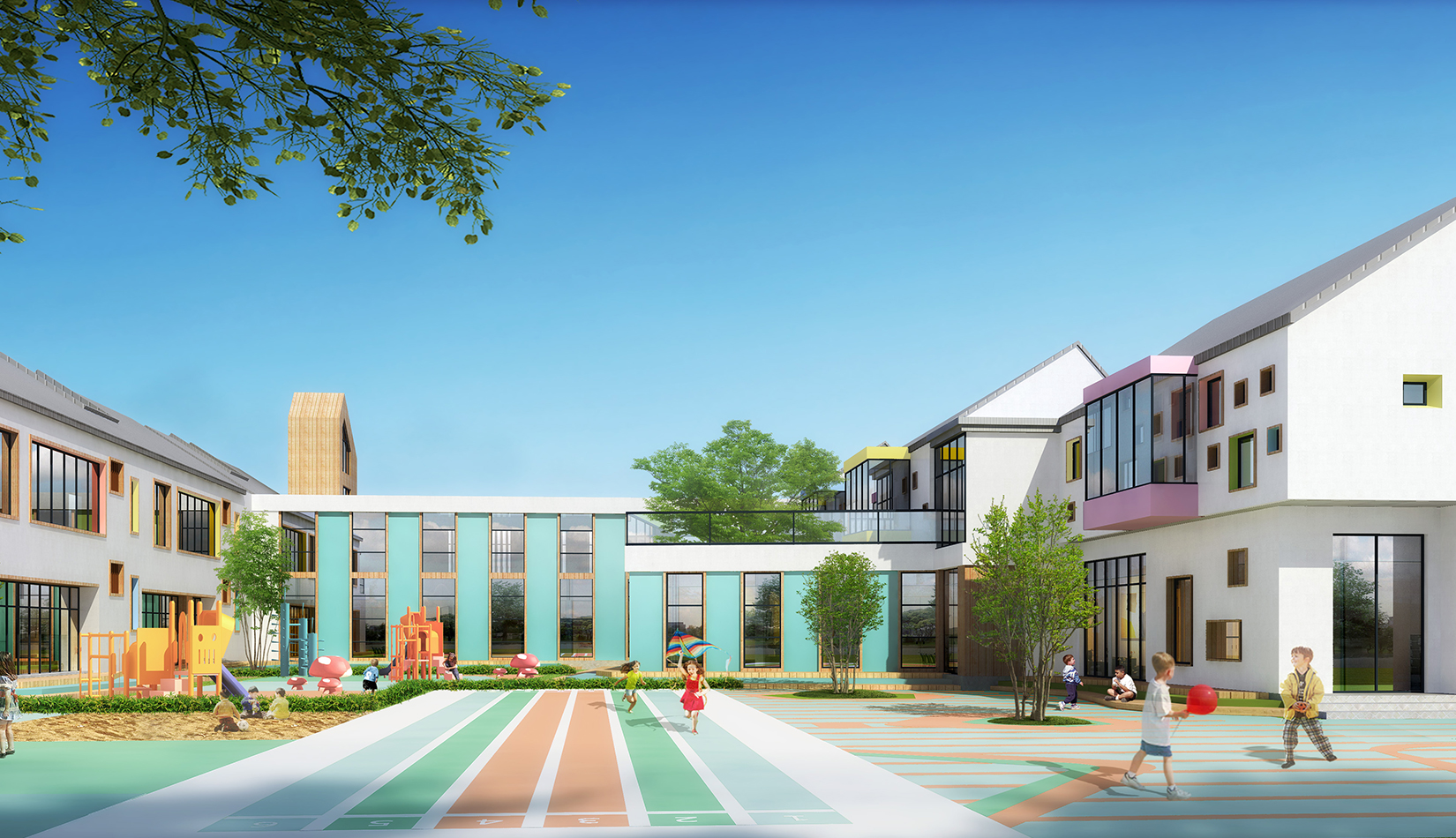 建筑造型來源于兒童最初對房子的印象并進行延伸,加上積木搭接形態(tài),形成C字形圍合的主體建筑,就像父母溫暖的懷抱;建筑造型跟兒童產生很好的親切感,讓兒童將上幼兒園成為快樂的事情。同時形態(tài)結合地緣文化特色,采用雙折坡屋頂,寓意展翅翱翔的海鷗。