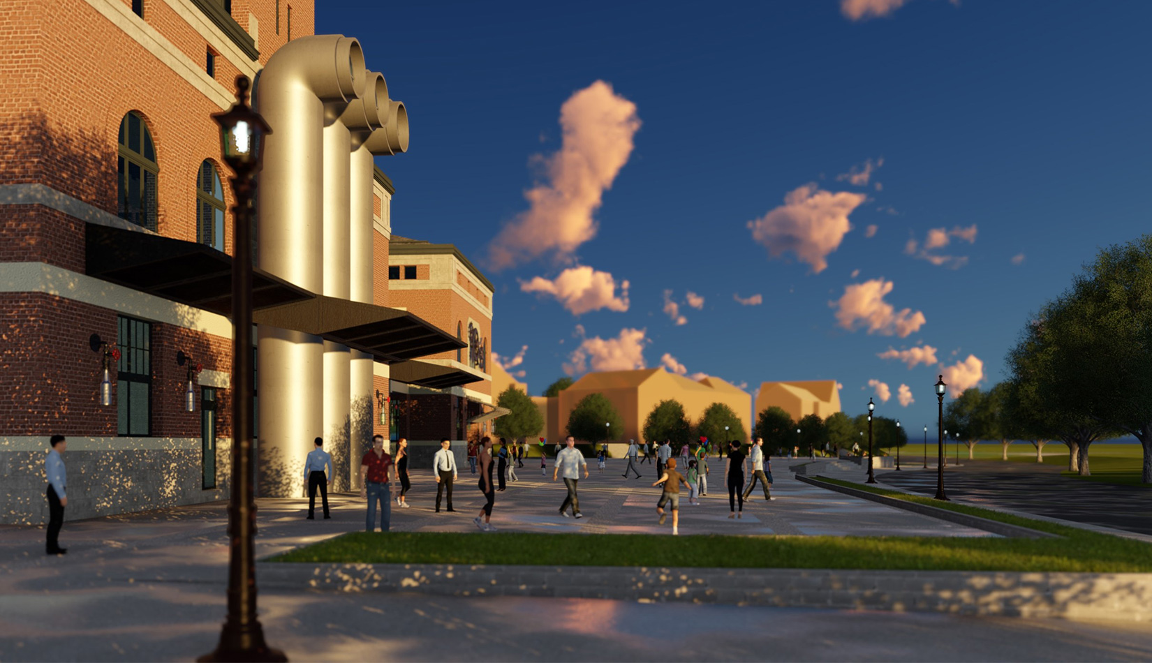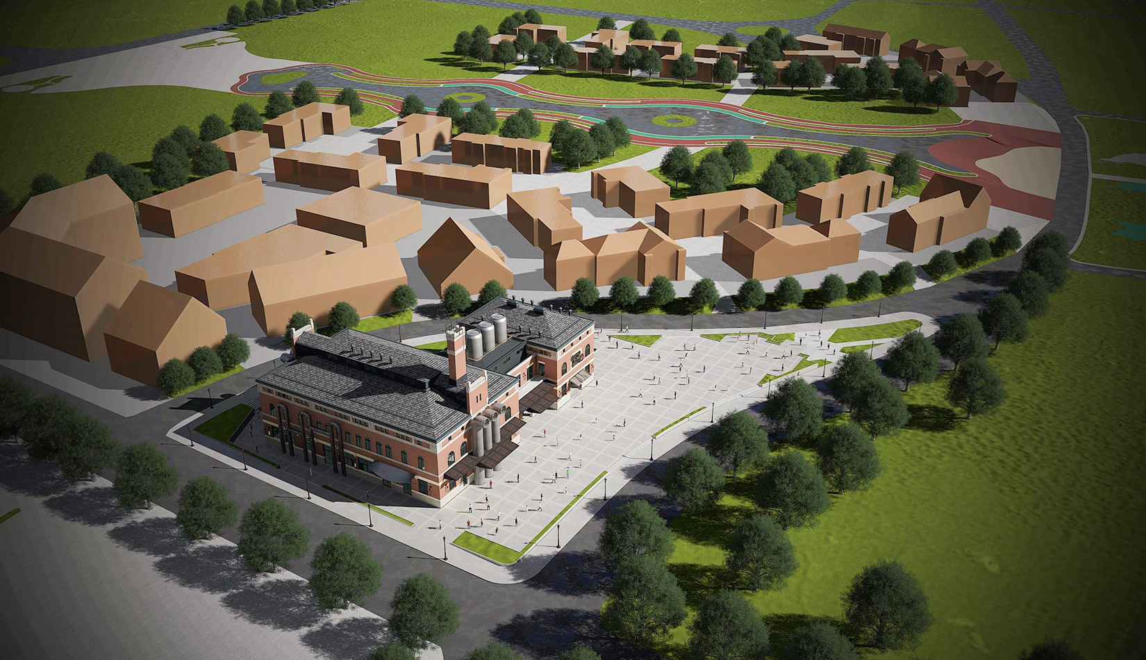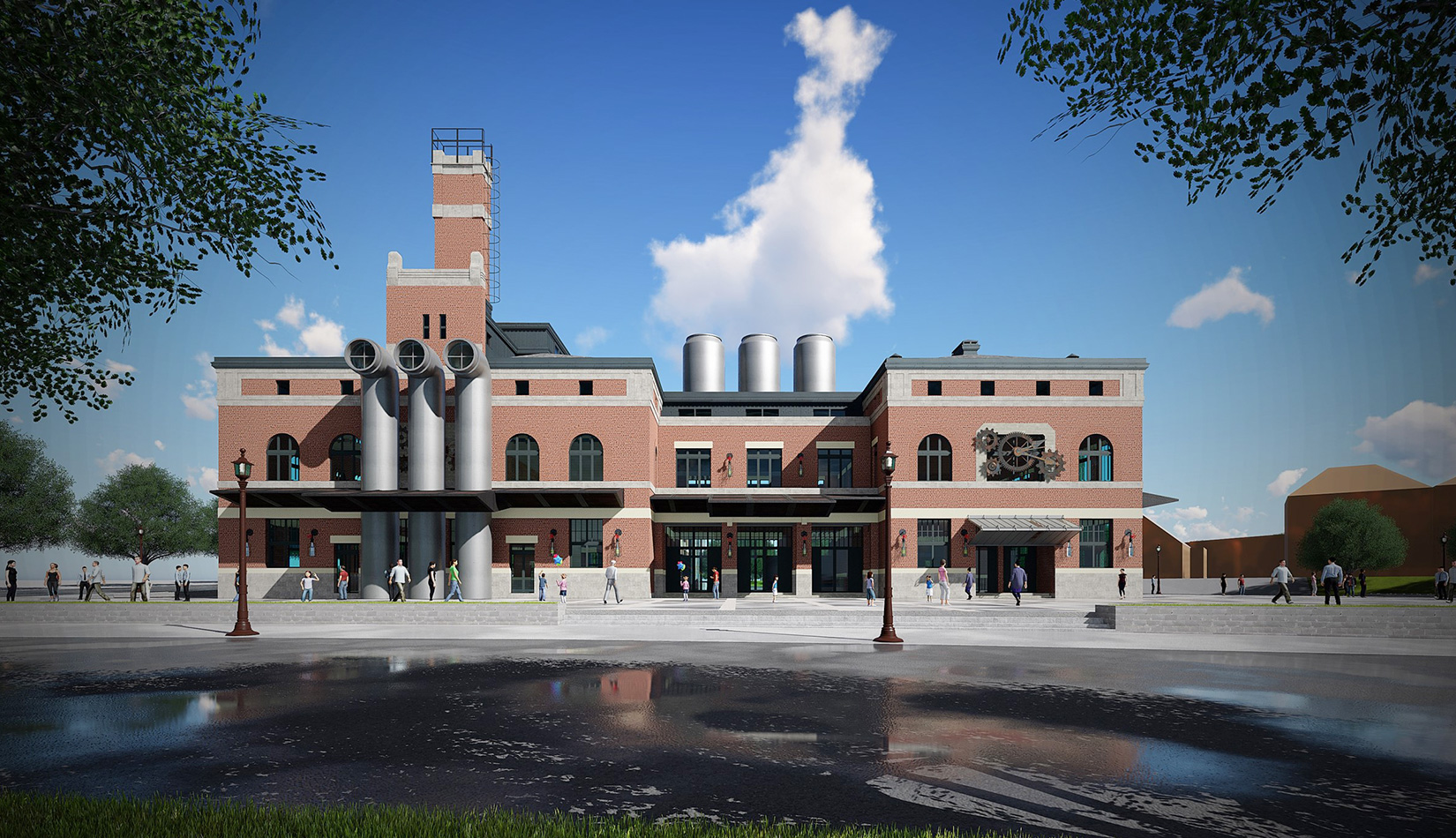 紅磚是工業(yè)風(fēng)的最佳表現(xiàn)元素之一,本案選取紅磚作為立面主要材質(zhì),加以真石漆、石材進(jìn)行點(diǎn)綴,磚塊與磚塊中的縫隙可以呈現(xiàn)有別于一般墻面的光影層次。屋面形式選取深灰色瓦屋面加以深色金屬板點(diǎn)綴,與立面形成強(qiáng)烈的視覺對比,旨在體現(xiàn)工業(yè)風(fēng)的粗獷氛圍。