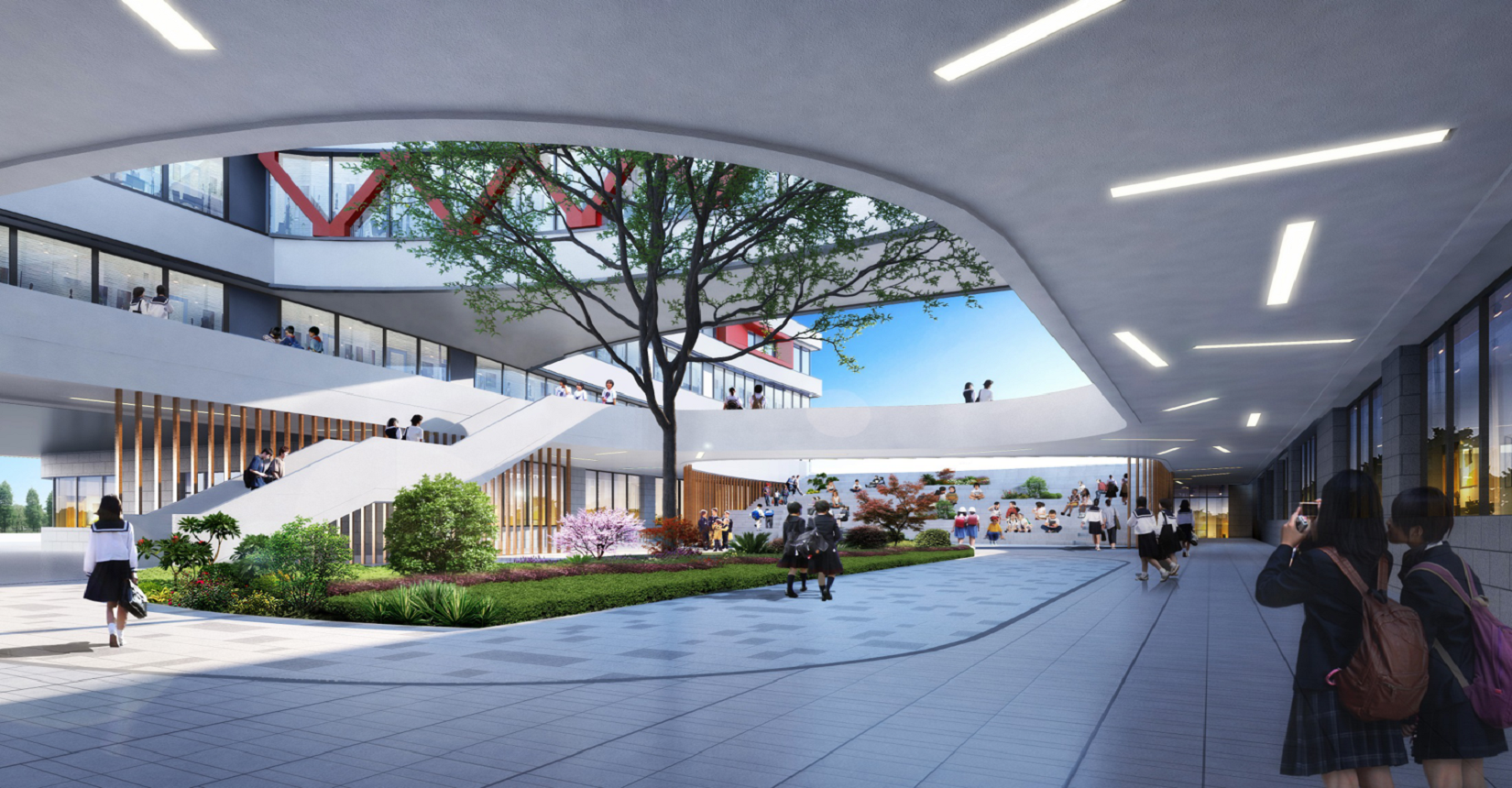 校園規(guī)劃采用曲線手法,營造流水姿態(tài),將東側(cè)山脈與西側(cè)河流連接在一起。設(shè)計現(xiàn)代化“山水”校園,使學(xué)生在自然中成長。營造活水發(fā)源的“源頭”意境,寓意教育為人類文化長河的源頭,呼應(yīng)學(xué)?!霸搭^”文化。曲線舒展的形體,整體采用白色色調(diào),局部以紅黃色進行點綴,風格純潔又不失活潑。