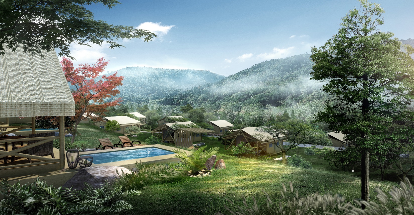 本項(xiàng)目的定位為自然、野奢的景觀風(fēng)格。對(duì)于野奢度假酒店景觀環(huán)境設(shè)計(jì)遵從“野”“奢”兩點(diǎn),融入荒野生態(tài)的設(shè)計(jì)理念,又要與場(chǎng)地相融合、與原生態(tài)相映、與當(dāng)?shù)氐拿袼罪L(fēng)情相交匯,突出當(dāng)?shù)氐奈幕黝},強(qiáng)調(diào)高品質(zhì)的自然、野奢度假,從而打造出一個(gè)具備個(gè)性與特色,使游客能夠享受到自然野趣體驗(yàn)的景觀環(huán)境。